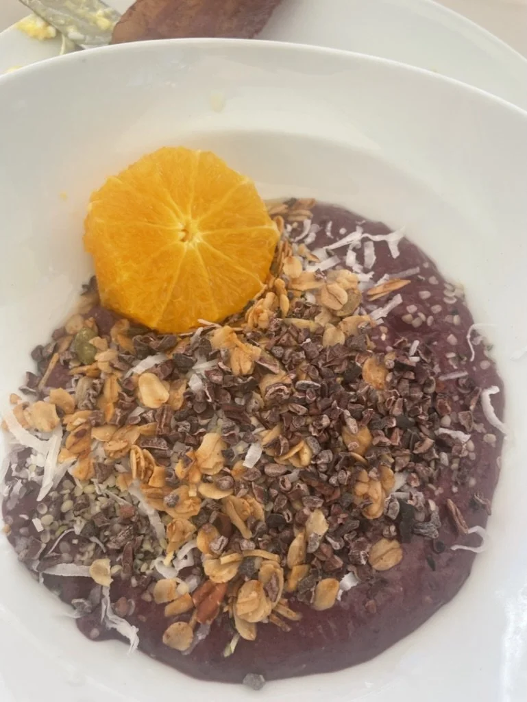 Pure Acai served with coconut flakes, chia seeds, cacao nibs, sunflower seeds, granola and an orange